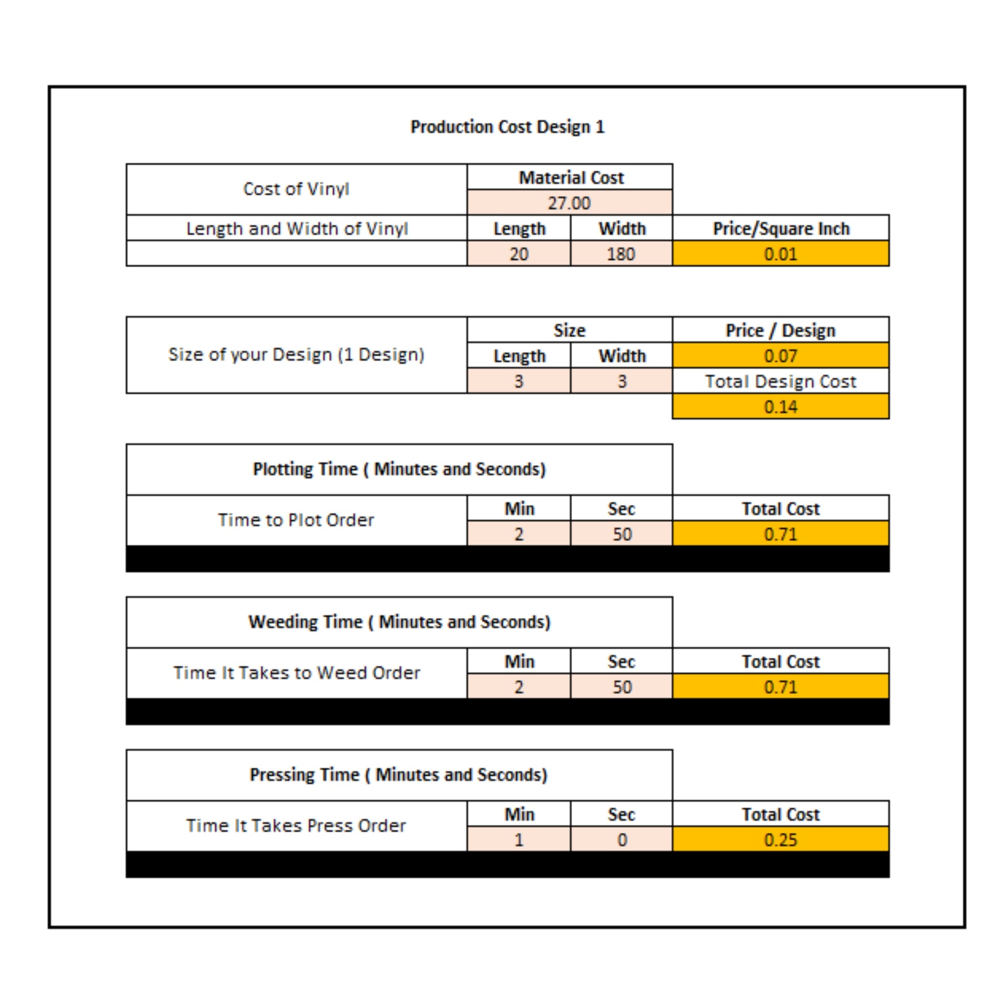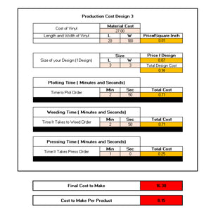 This calculator is designed to calculate the cost to make a 1 to 3 color heat transfer vinyl (HTV) products or projects. Simply input all your production information, such as material and labor costs, and the calculator will provide the cost to make your HTV designs. It’s perfect for those who need an accurate estimate for single or multi-color vinyl projects.