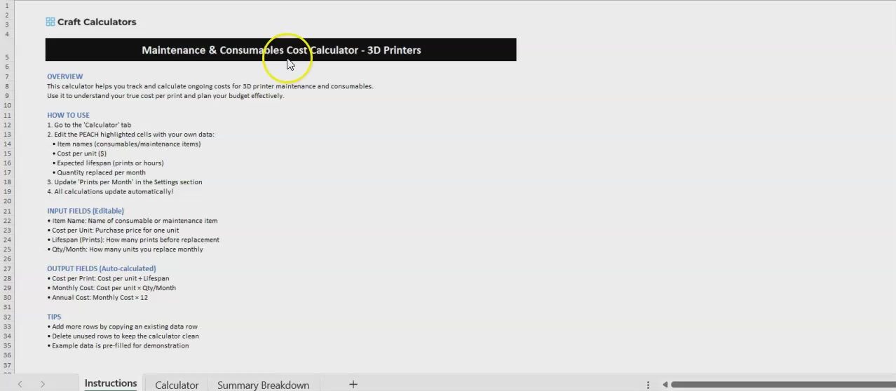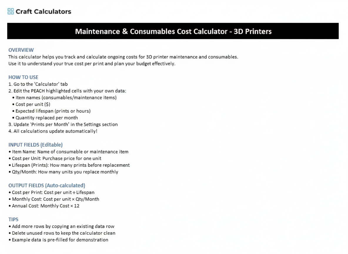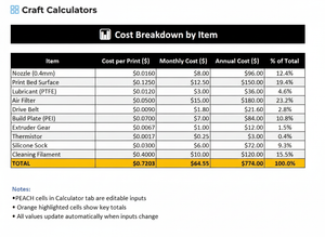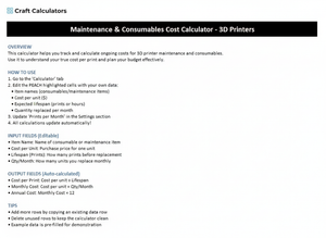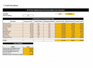 Maintenance adds up! With the 3D Printer Maintenance Cost Calculator, you’ll never overlook the true cost of keeping your printer in top shape. Track repairs, parts, cleaning, and regular service to make sure your pricing covers every dollar spent.