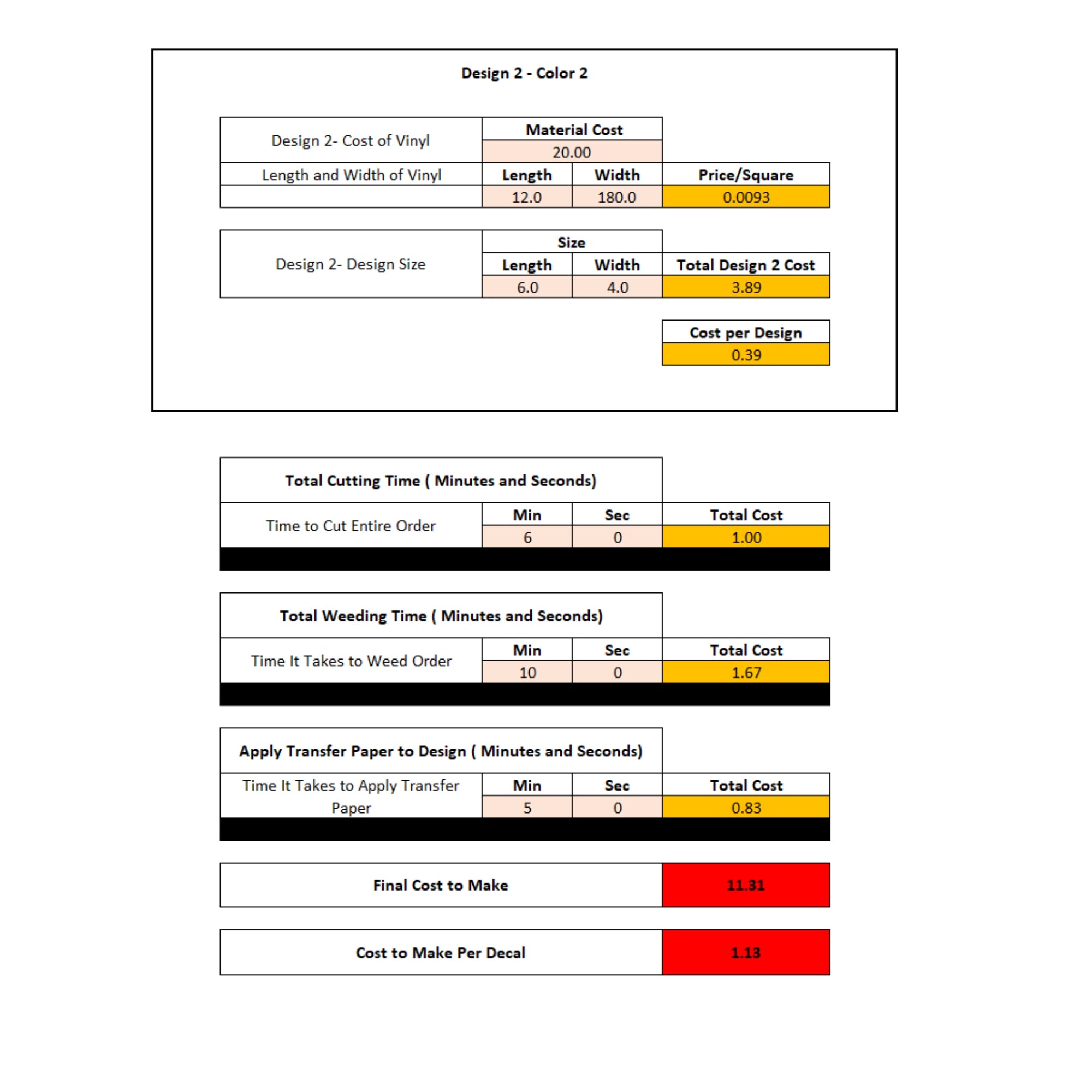 Get precise cost-to-make pricing for 2-color vinyl decals, whether you're producing one or many. This calculator is tailored for two-color vinyl designs and factors in elements such as design time cost, plotting, weeding for both colors, and applying transfer paper to the design. You will receive the final cost to make for the entire project as well as the cost per decal.