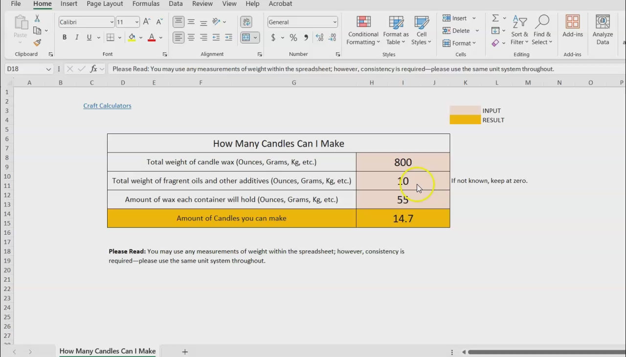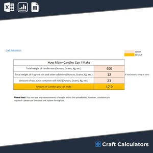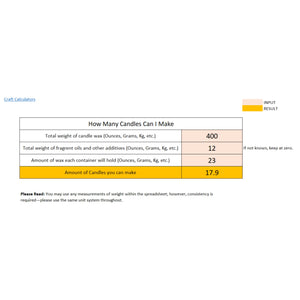 This calculator is designed to help you figure out how many candles you can make by entering your total wax weight, fragrance and additive weight, and jar size. It's a perfect tool for candle makers looking to streamline their production process and ensure accurate calculations. Simply input your data, and the calculator will give you an exact count of the candles you can produce.