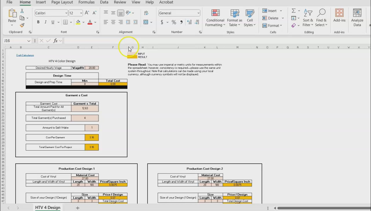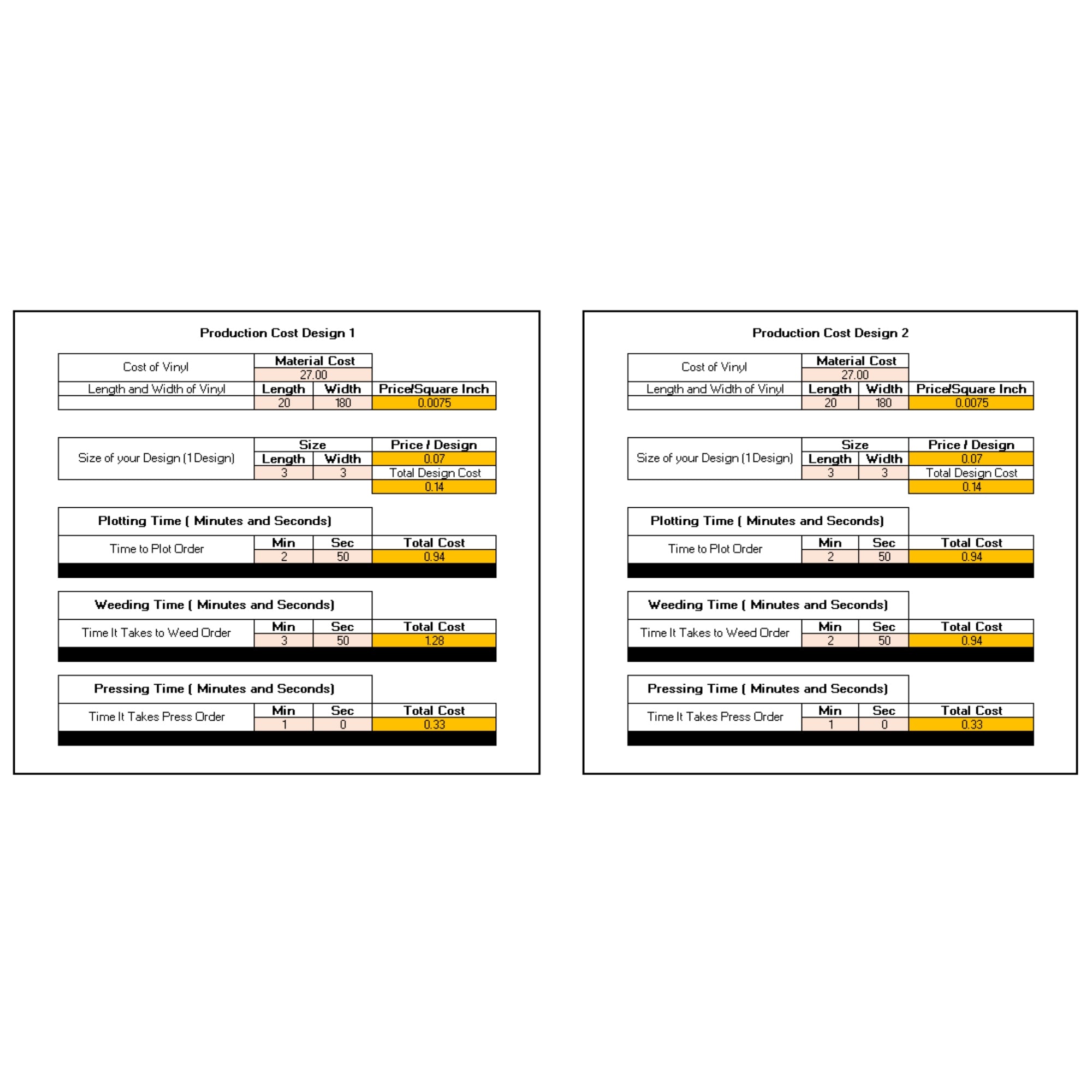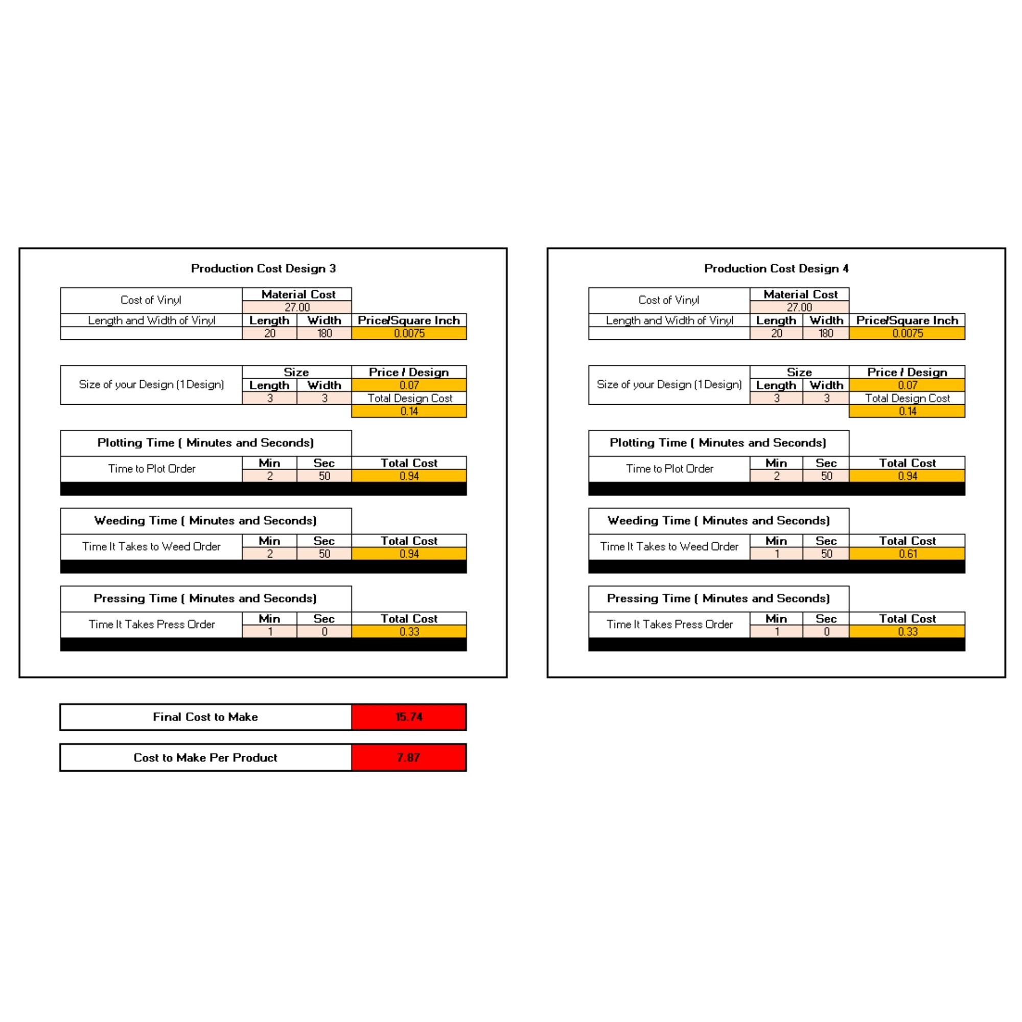 This calculator is designed to calculate the cost to make a heat transfer vinyl (HTV) product or project with 1 to 4 colors. Simply input all your production information, such as material and labor costs, and the calculator will provide the cost to make your HTV designs. It’s perfect for those who need accurate estimates for single-color to four-color vinyl projects.