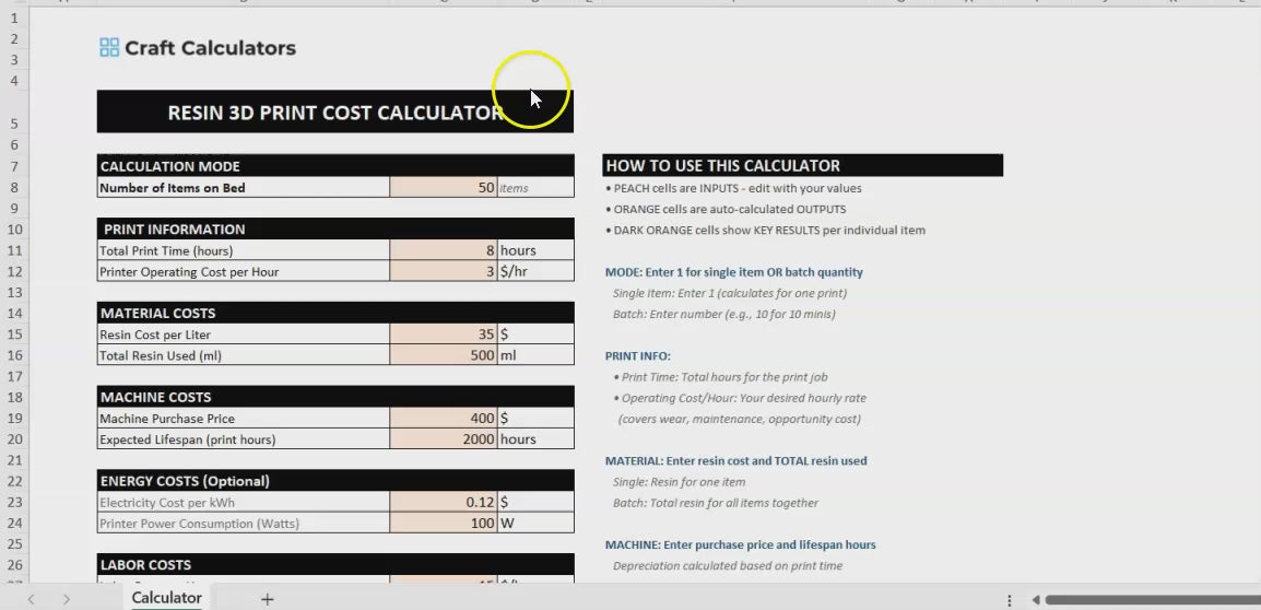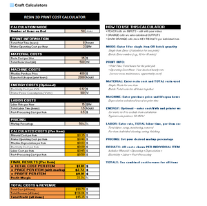 Get a clear, detailed breakdown of your resin 3D printing costs with this dedicated calculator. From resin usage and supports to post-processing and wear-and-tear, every variable is covered. Designed for serious makers and business owners, this tool helps you charge what your resin prints are truly worth—no more guesswork, just smart, profitable pricing.