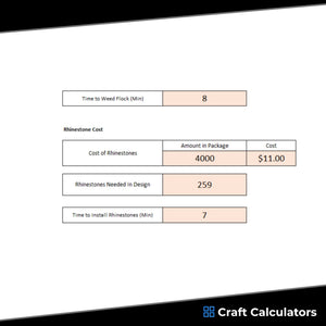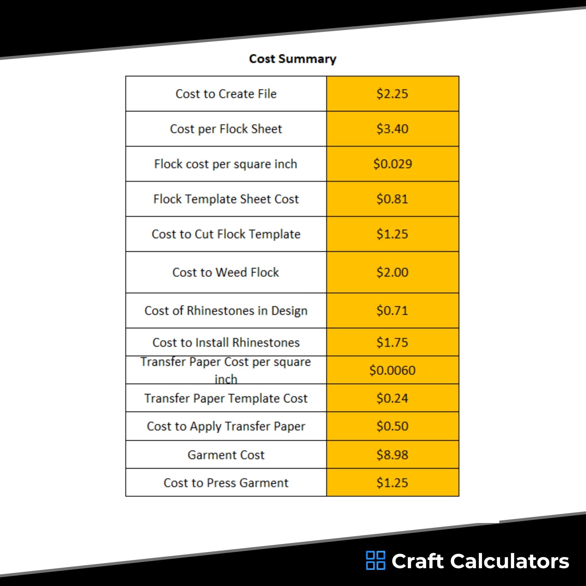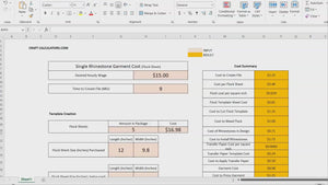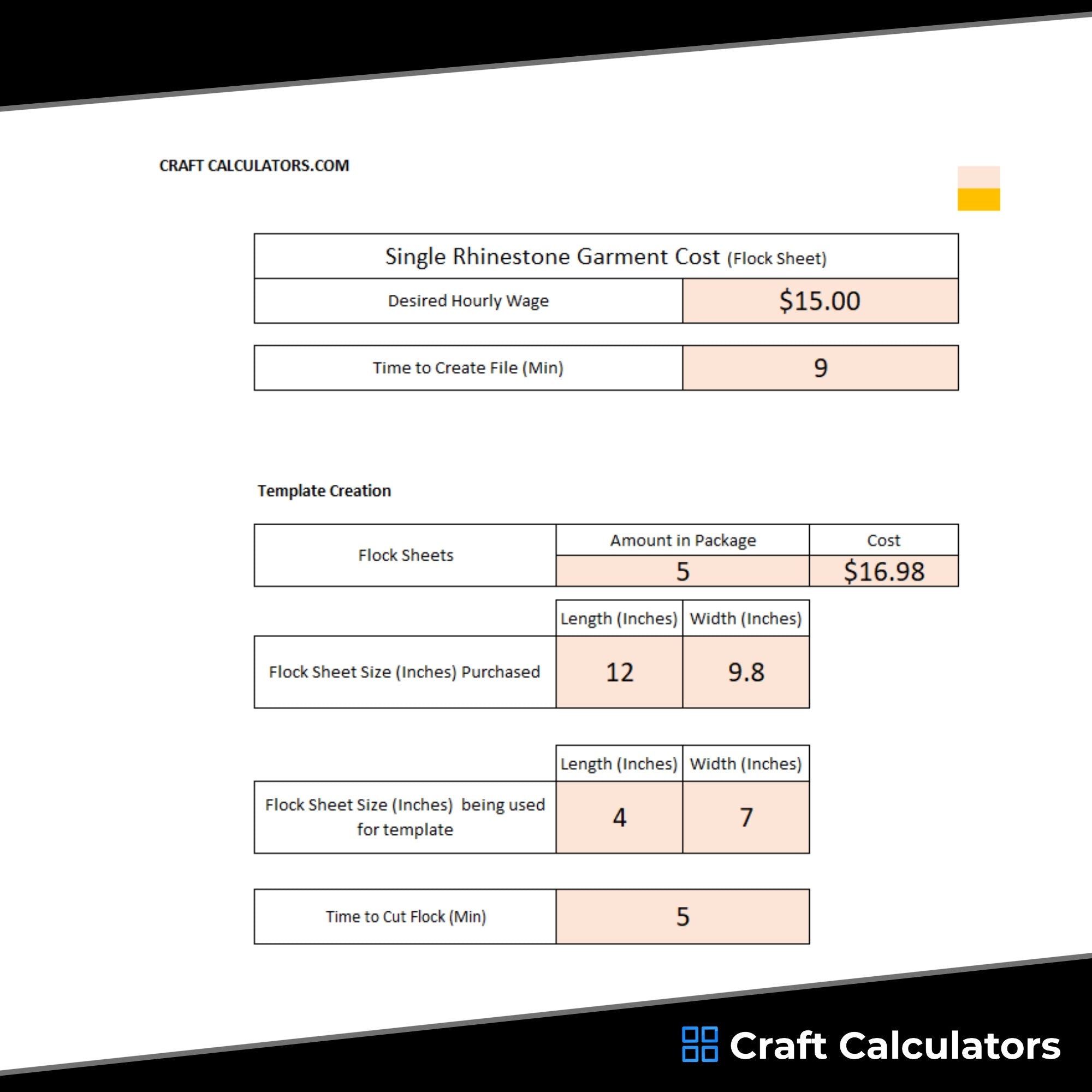 Rhinestone Single Garment Cost Calculator- Using Flock Sheets | Rhinestone Product Calculator Spreadsheet