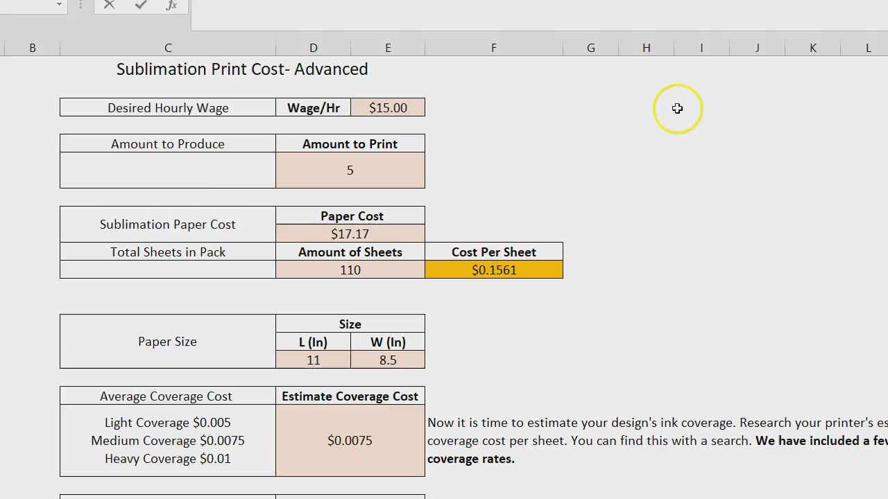 Sublimation Design Cost- Ink Cost- Calculator
