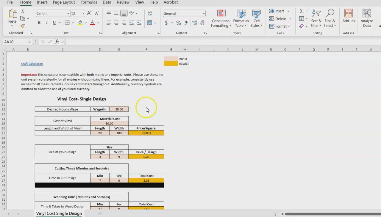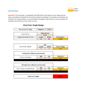 This calculator is designed to calculate the cost to make pricing for your single color vinyl designs. Simply enter the size of your design and the cost of your vinyl material to get an accurate estimate of how much it will cost to produce each single color vinyl design. Ideal for optimizing your pricing strategy.