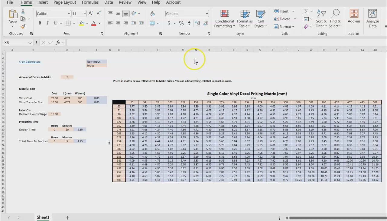 This pricing matrix is designed for single-color vinyl decals using metric units (millimeters).